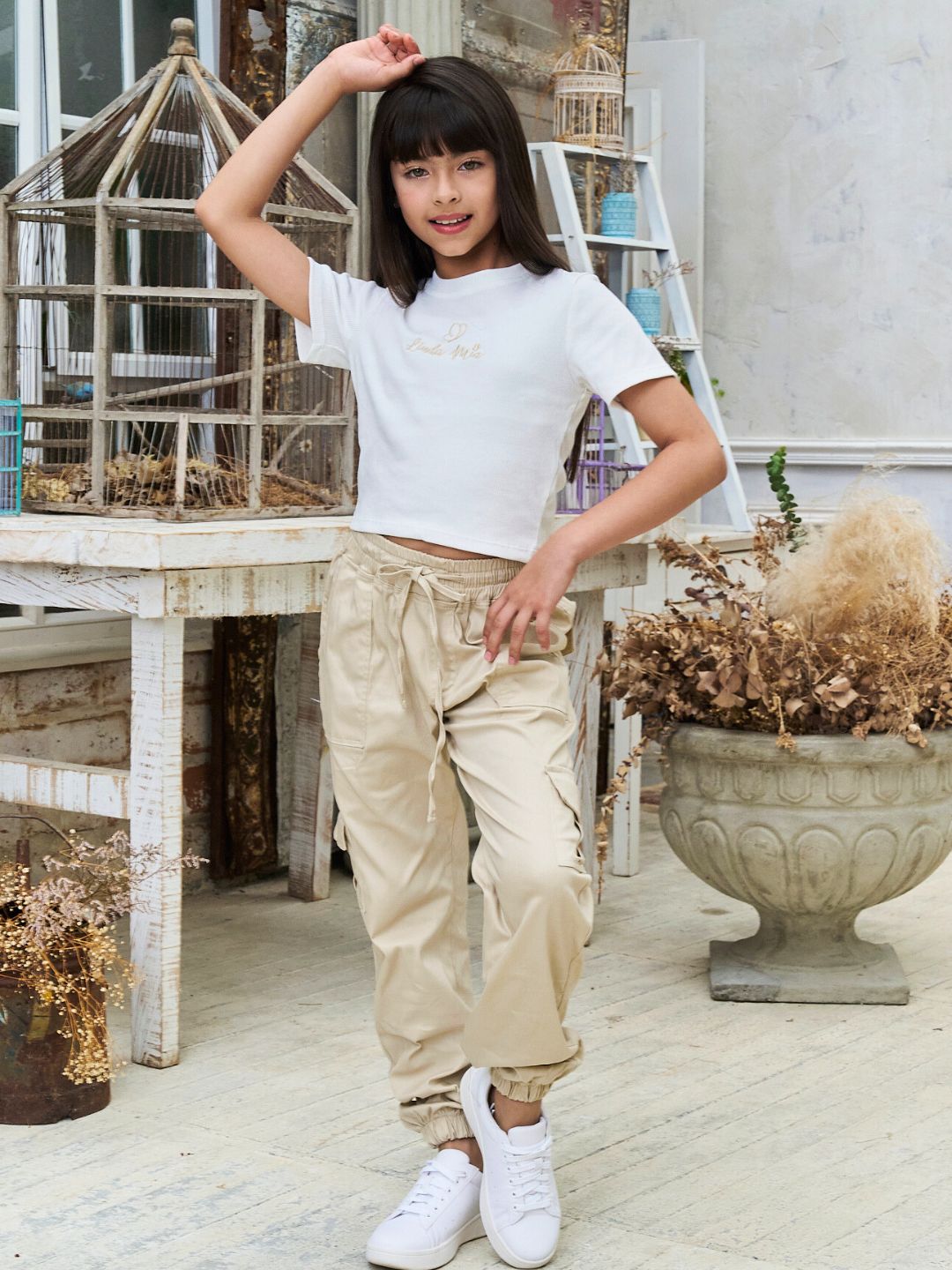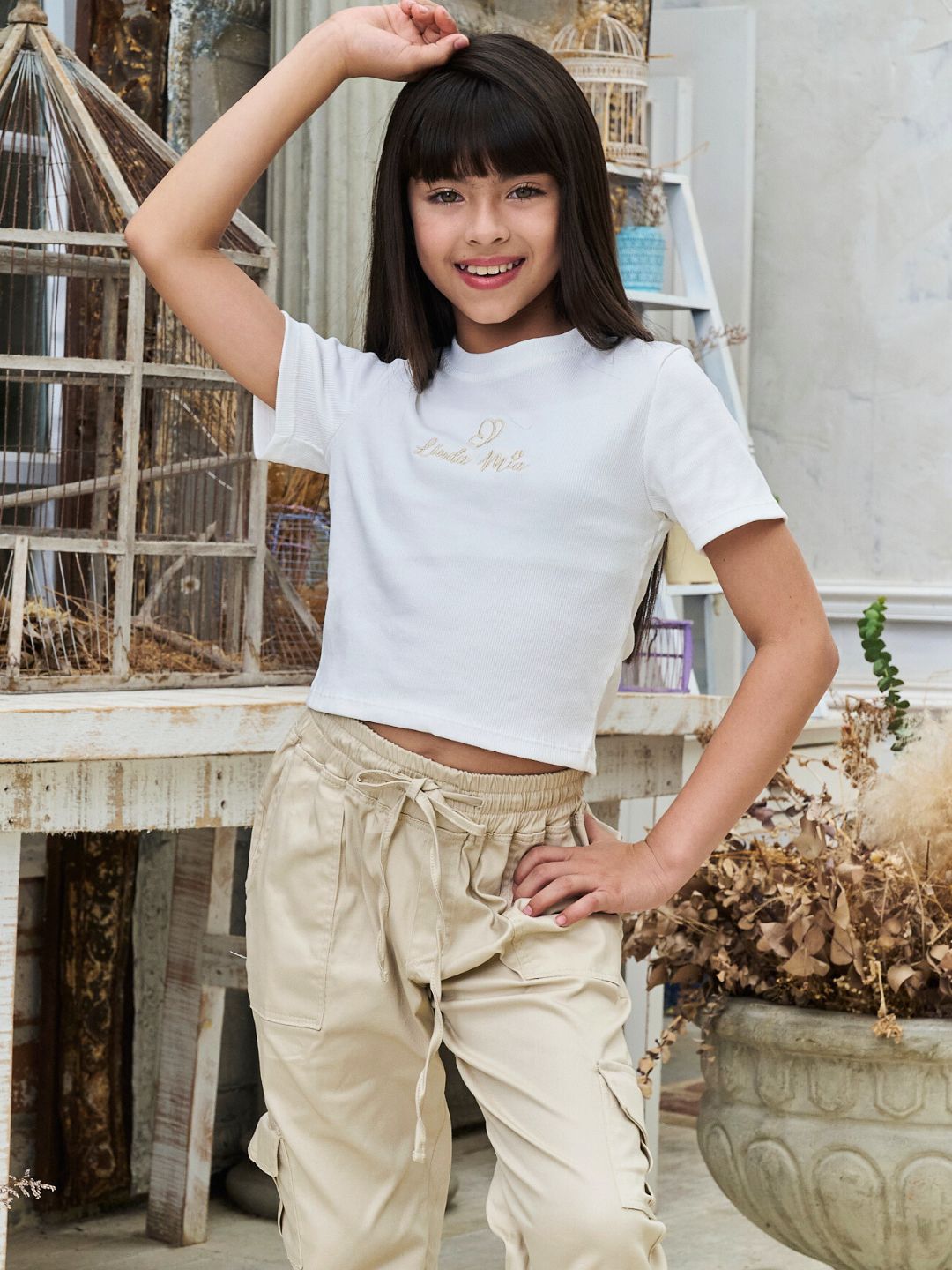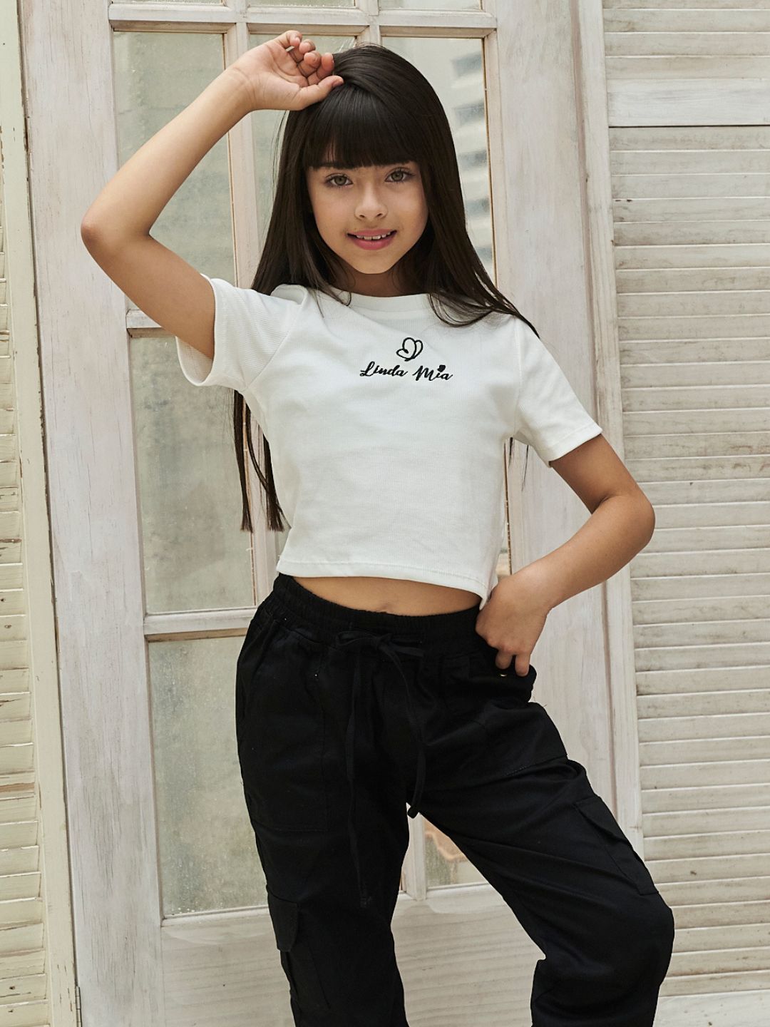 La modelo tiene 9 años, mide 1,35cm y está usando la talla 10-12