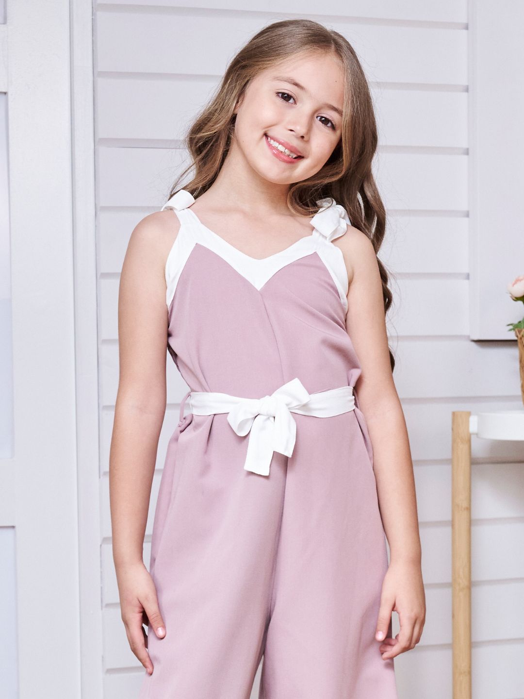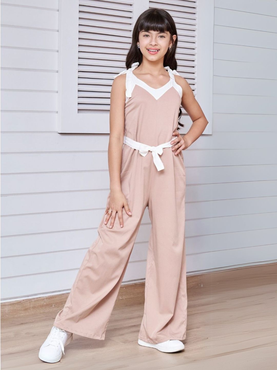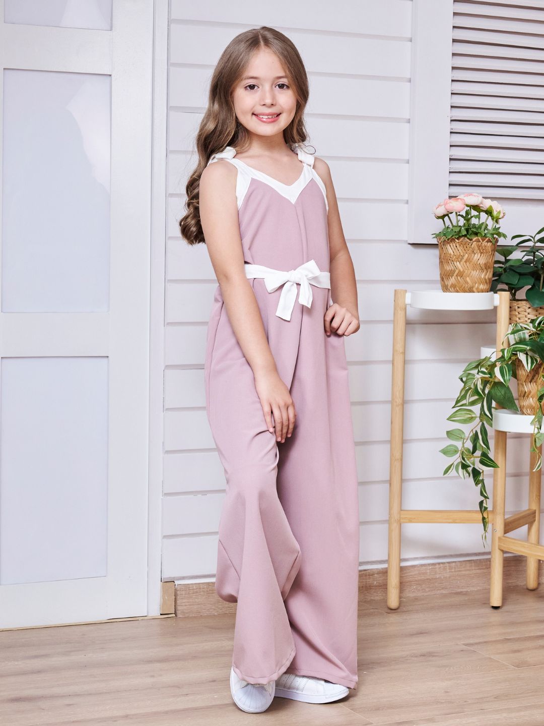 La modelo del set lila tiene 7 años, mide 1,30cm y está usando la talla 10-12, La modelo del set camel tiene 10 años, mide 1,45cm y está usando la talla 14-16.