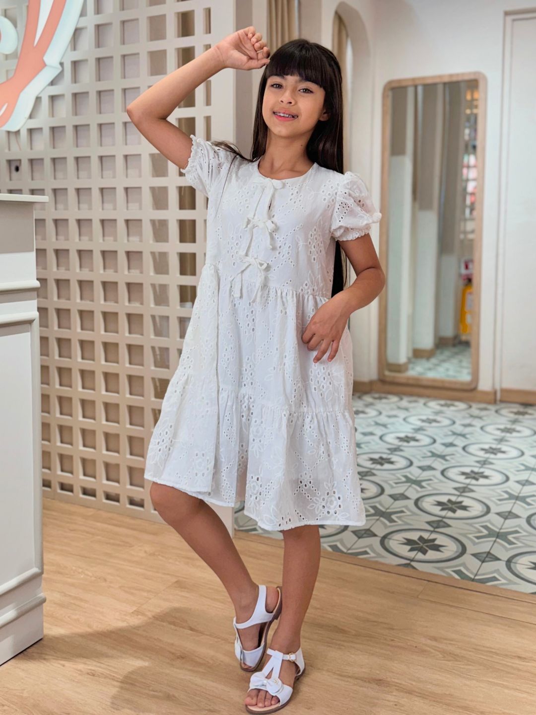 La modelo del vestido azul tiene 5 años, mide 1,20 y está usando la talla 6-8.