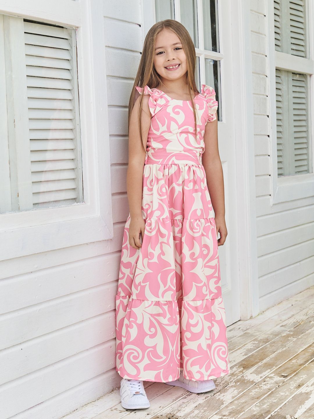 La modelo del vestido azul tiene 9 años, mide 1,40m y está usando la talla 10-12, la modelo del vestido rosado tiene 5 años, mide 1,20m y está usando la talla 6-8